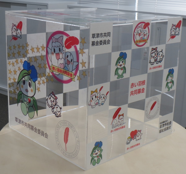 草津市共同募金委員会からの依頼により、赤い羽根共同募金箱のラッピングを行いました。この募金箱は、一辺50cmのおおきな立方体で、アクリル樹脂でできています。その材質からくる透明性を確保するため、ラッピングも透明なフイルムを主に使用しています。 正面は、赤い羽根共同募金のキャラクターと、草津市社会福祉協議会のふくちゃんを大きく配し、両側面は同様のキャラクターを市松模様の配置としています。