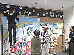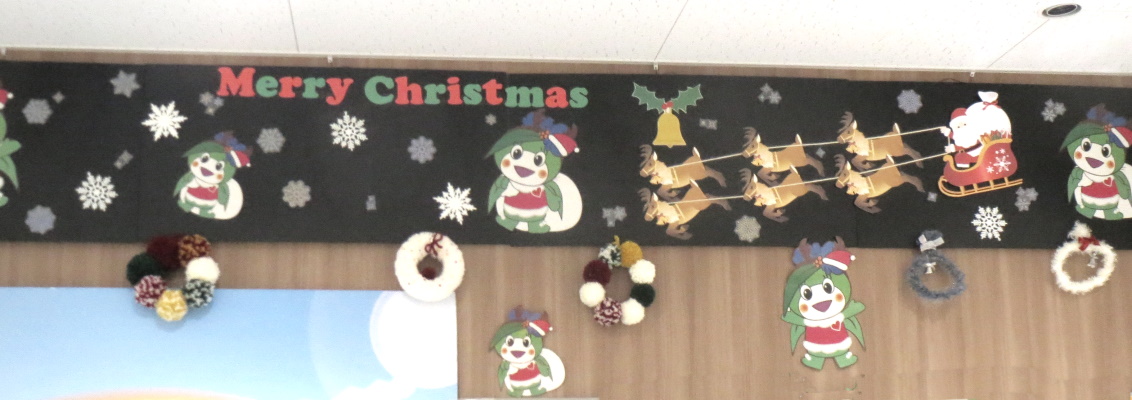 今回は製作時間の余裕もありましたので、飾の構想に少しは時間を割くことができ、また、草津市社会福祉協議会のマスコットキャラクターのふくちゃんがサンタクロースとなって大勢で駆けつけてくれました。