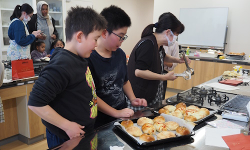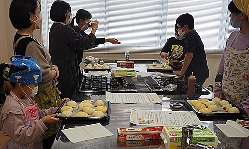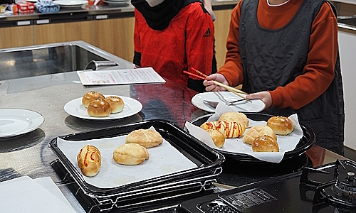 作業が進むにしたがい、パンづくりにもなれ、一人当たり5個のぱんを作り上げました。そして、焼きあがったパンを前に写真を撮ったり、試食してみて「おいしい」と歓声をあげていました。